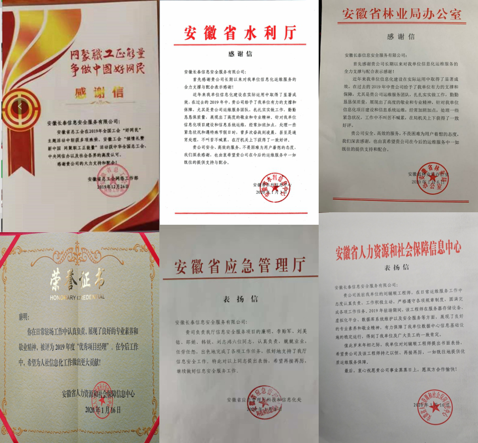 2020年伊始,长泰公司收到了五份特殊的感谢信。感谢信来自安徽省各省直单位,信中高度评价了长泰公司在2019年项目驻点运维服务、以及在各单位信息化建设、政务公开活动中的专业、敬业精神,对在各项保障活动中的技术人员表示了高度赞扬与表彰。
