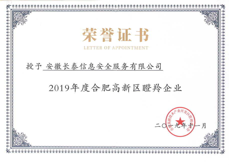 2019年,11月20日,合肥高新区2019年高成长企业榜单正式发布,高新区共认定了502家高成长企业,其中雏鹰企业275家、瞪羚培育企业72家、瞪羚企业149家、潜在独角兽企业3家、独角兽企业1家、平台型龙头企业2家。作为其中的高科技企业——安徽火博网-火博(中国)成功入选瞪羚企业榜单。
